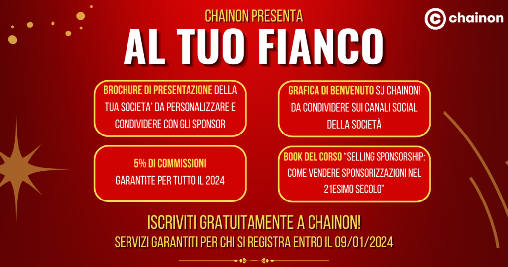 CHAINON PRESENTA “AL TUO FIANCO”: LA PROMOZIONE PER LE SOCIETA’ SPORTIVE VALIDA SINO AL 9 GENNAIO 2024 CON CUI LANCIARE GRATIS LA PROPRIA OFFERTA BASE DI SPONSORIZZAZIONI SUL MARKETPLACE E FRUIRE DI SERVIZI AGGIUNTIVI COME L’ASSISTENZA CONTINUATIVA E IL CORSO “SELLING SPONSORSHIP” ChainOn, il rivoluzionario marketplace digitale delle sponsorizzazioni, presenta AL TUO FIANCO, la promozione […]